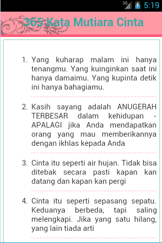 Aplikasi kata kata mutiara. Aplikasi untuk membuat kata kata atau tulisan keren di android. Jangan lupa bagikan ke sosmed kamu agar teman teman kamu bisa membacanya ya. Di dalam aplikasi kata kata mutiara cinta ada ratusan lebih kata kata cinta yang bisa anda ucapkan kepada pasangan anda setiap hari untuk lebih erat menjalin hubungan kekasih. Karena itu kali ini androbuntu akan membagikan lebih dari 500 kata mutiara islami untuk status facebook dan caption instagram.